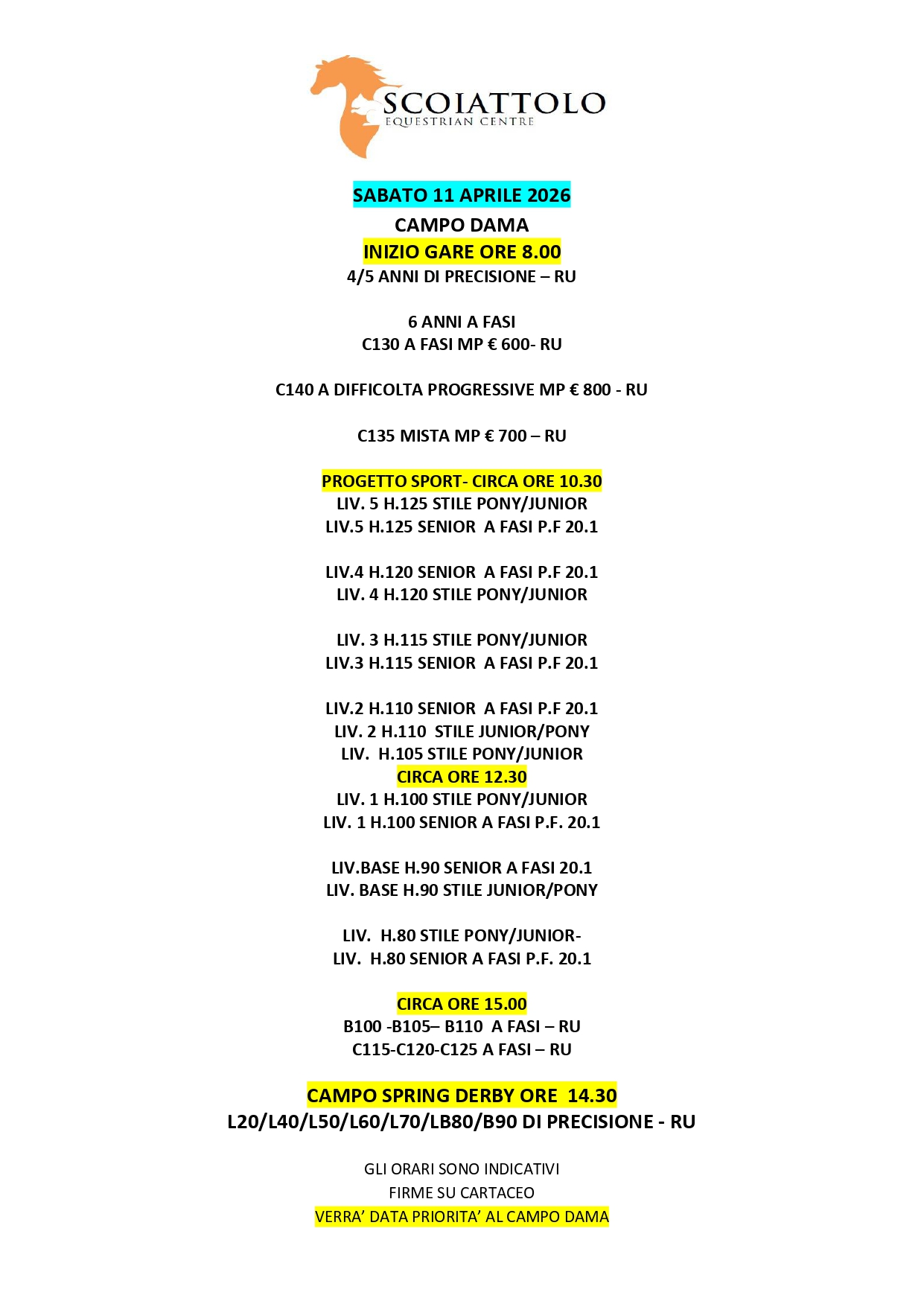 ORARIO SABATO 11 APRILE 2026